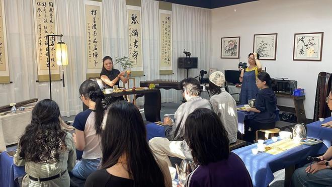 午后,茶艺课堂树影斑驳、琴音环绕,茶艺老师从中国悠久的茶文化历史开始,介绍中国茶艺文化的历史、发展和基本知识,共同感悟茶文化的无穷魅力和历史厚重。在老师悉心指导下,成员们学习动手为自己泡上一杯茶,热水在茶具中缓缓流转,茶叶在水中翻滚、苏醒,茶香氤氲,大家在泡茶、品茶的过程中,收获平和美好的心境,真切领悟到泡茶不仅是技艺,更是修身养性的生活方式。