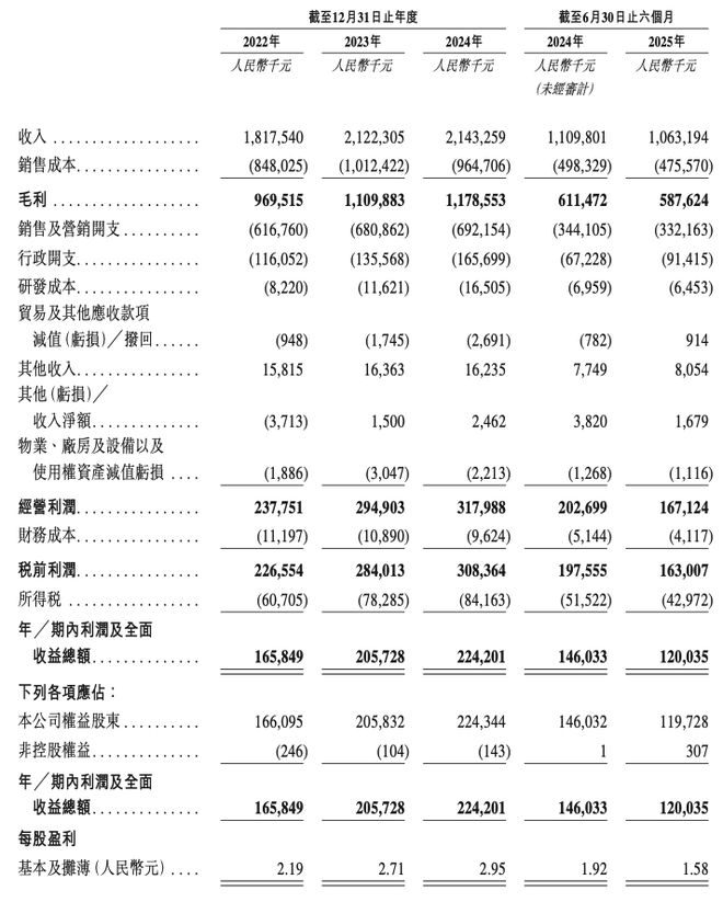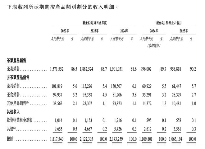 2022年、2023年、2024年和2025年上半年(下文简称“报告期内”),八马茶业加盟店数量分别为2579家、3054家、3255家、3341家,同期,来自加盟渠道的销售收入分别为9.12亿元、10.73亿元、10.90亿元及5.23亿元,分别占各期总收入的50.2%、50.6%、50.9%及49.1%。